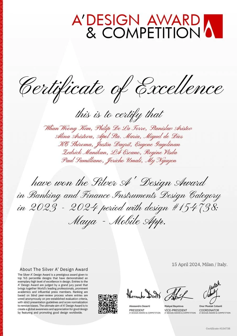 Maya was awarded the Silver A’ Design Award, one of the world’s most prestigious recognitions for excellence in design. This award celebrates Maya’s bold rebrand and its reinvention of what a digital bank can look and feel like in a fast-evolving, youth-driven market.